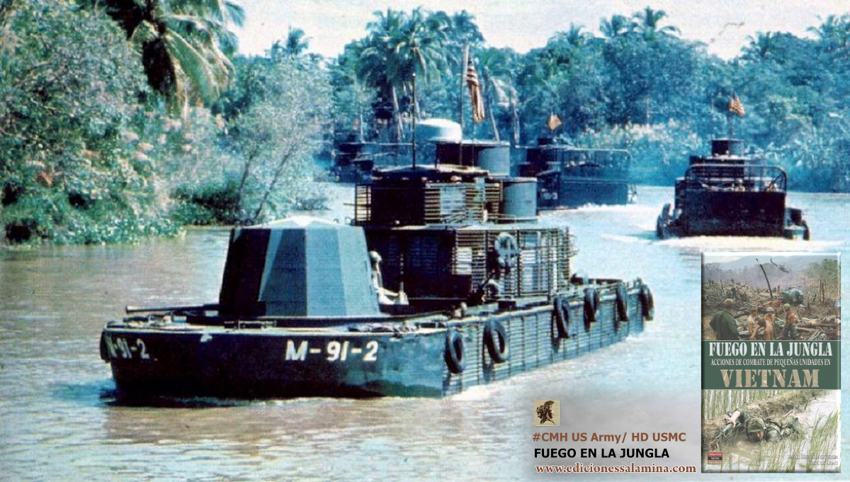Mientras continuaba la lucha en el río, los disparos de las armas automáticas golpeaban los cascos, algunos de ellos procedentes de búnkeres situados a menos de un metro de la orilla. A pesar del fuego de respuesta de los barcos, las granadas contracarro y los proyectiles de los cañones sin retroceso seguían lloviendo desde los búnkeres de barro situados a ambos lados del río. Los disparos más intensos procedían del este, de la zona donde los informes de inteligencia habían situado al Viet Cong. Con una ráfaga de proyectiles explosivos de 40 mm contra la abertura de un búnker en la orilla oriental, un artillero de la Marina voló la parte superior de la fortificación y la silenció. Aunque la mayoría de las posiciones enemigas se encontraban a menos de cinco metros de la orilla y formaban una zona de aniquilación de 1.500 metros de longitud, pocos soldados del ejército alcanzaron a atisbar algo más del enemigo que no fuese el destello de sus armas.